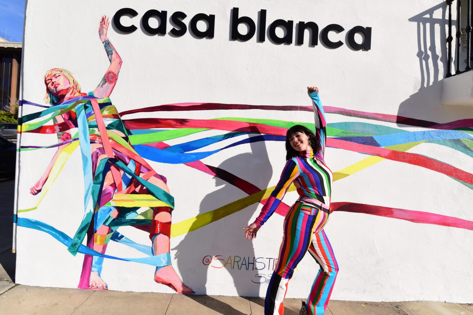 F&F Properties commissioned Sarah Stieber to add color and vibrancy to the exterior of the Casa Blanca Apartment Complex — which takes over the entire city block. Originally constructed in the early 1900’s to house workers and visitors of the World’s Fair, Stieber honored the historic building with a sprawling mural that celebrates art, culture, and the very spirit of its origin.