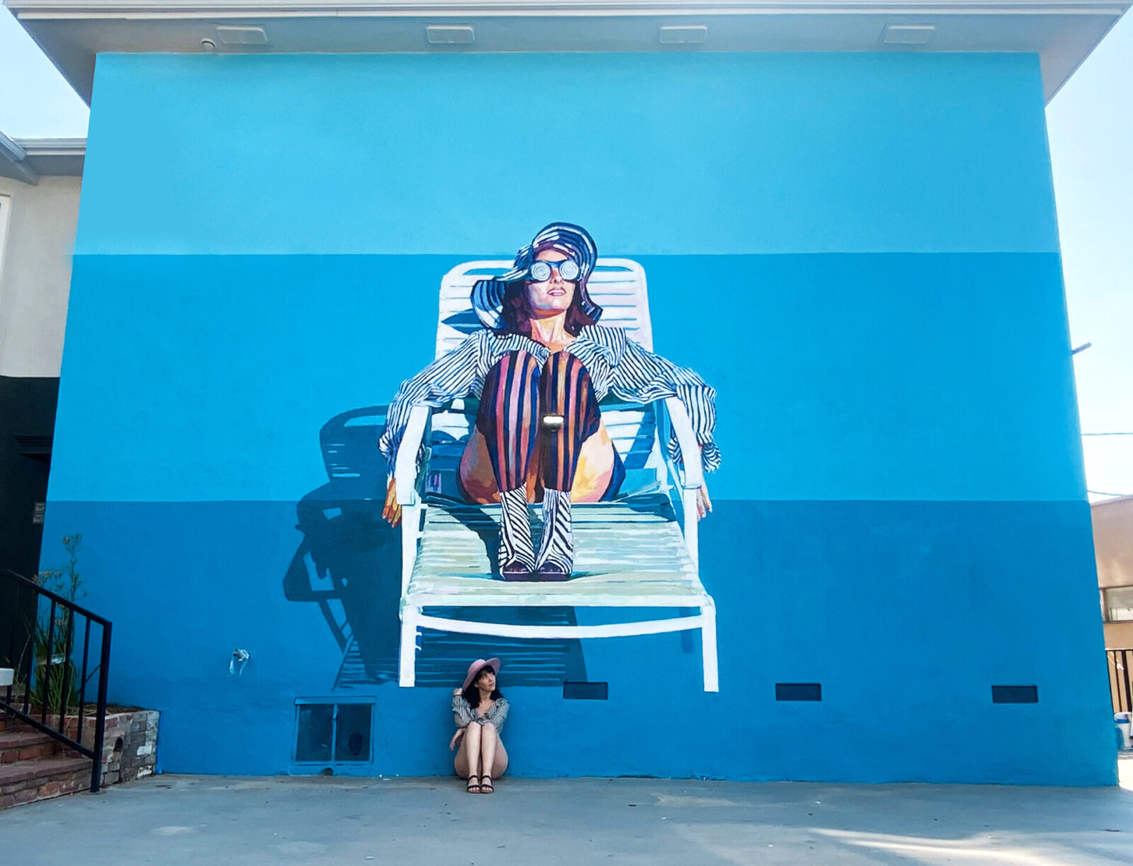 Painted for the courtyard of a Los Angeles Apartment Complex, this site-specific mural brings a classic reference to Old Hollywood aesthetics. The orientation of the figure was also designed to add depth to the space, and serve as an interactive element. Here the figure is lounging, and sunbathing just as the residents do within this courtyard!