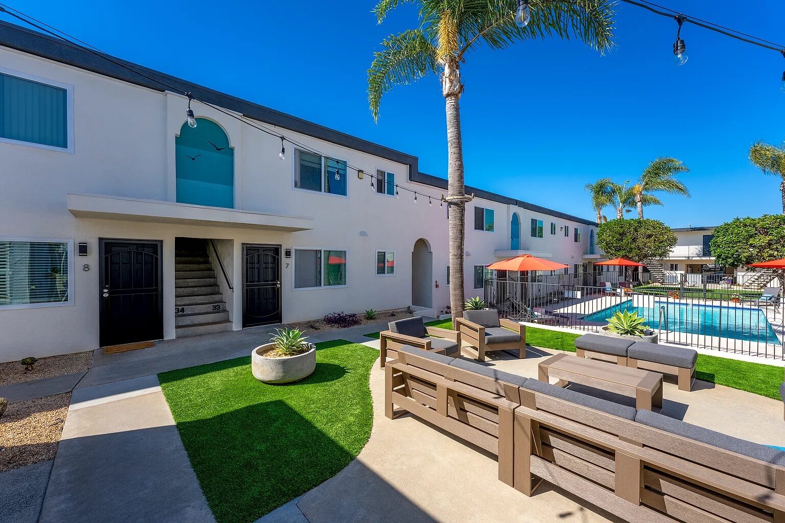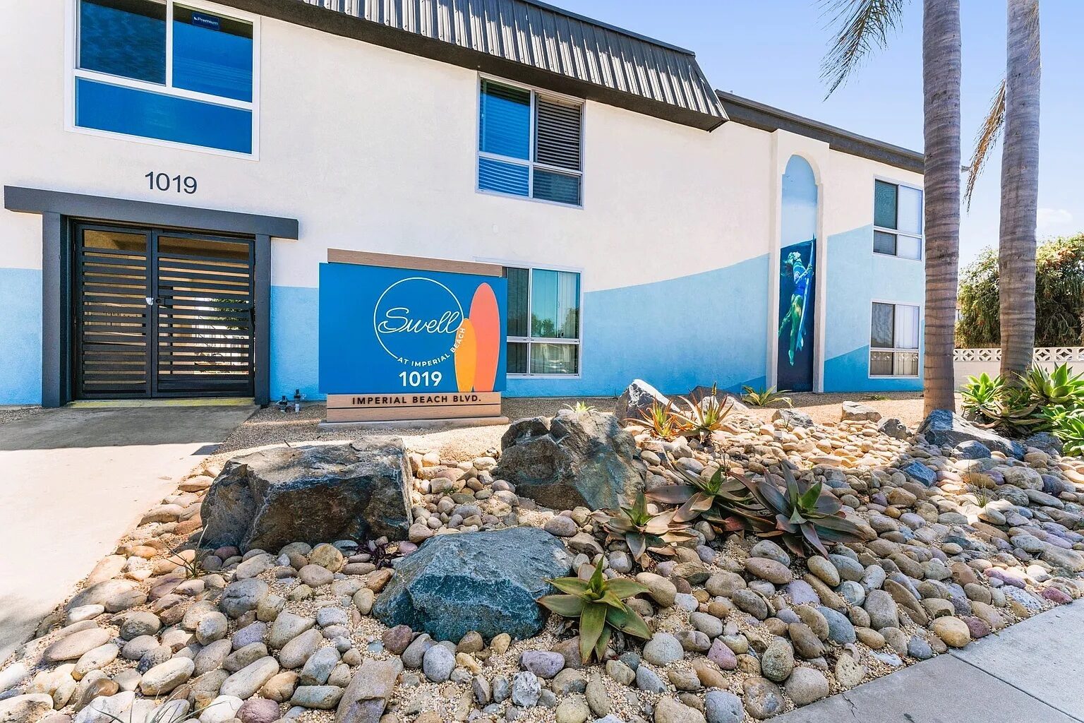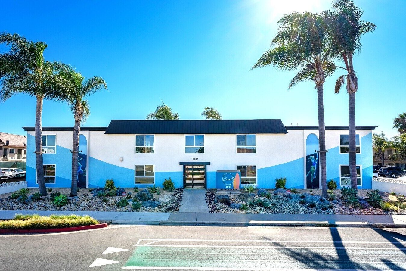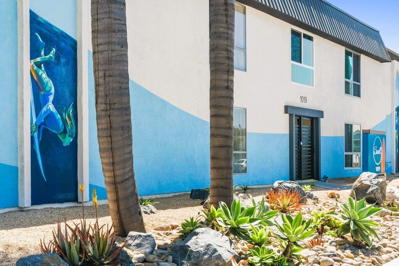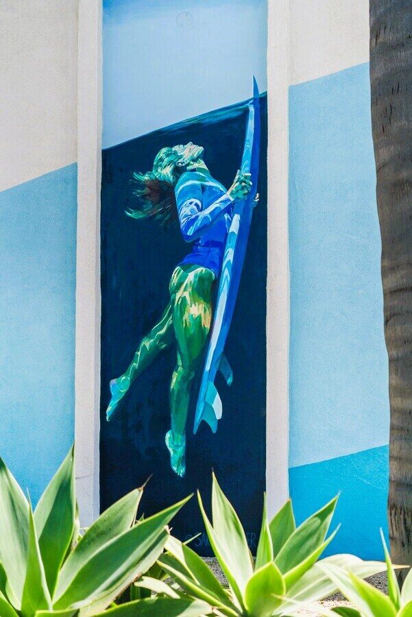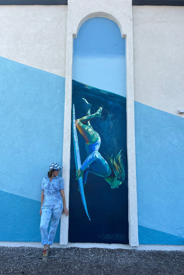 Sarah consulted on color and design throughout the development of this 50 unit apartment complex. Honoring the surf culture of this beach neighborhood, Sarah collaborated with Olympic Gold Medalist, and professional snowboarder and surfer, Lindsey Jacobellis to bring the visual concept to life. The two murals of Lindsey duck diving are connected with a giant ocean swell that sweeps across the front of the building.