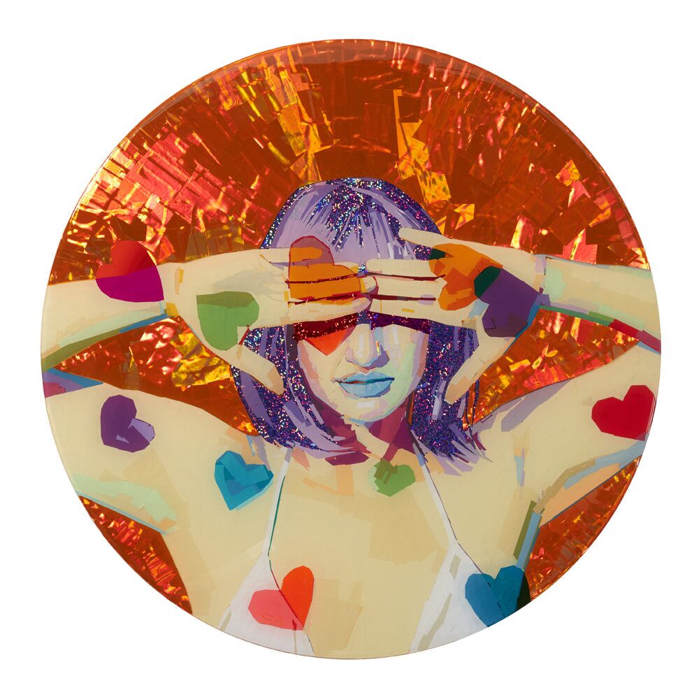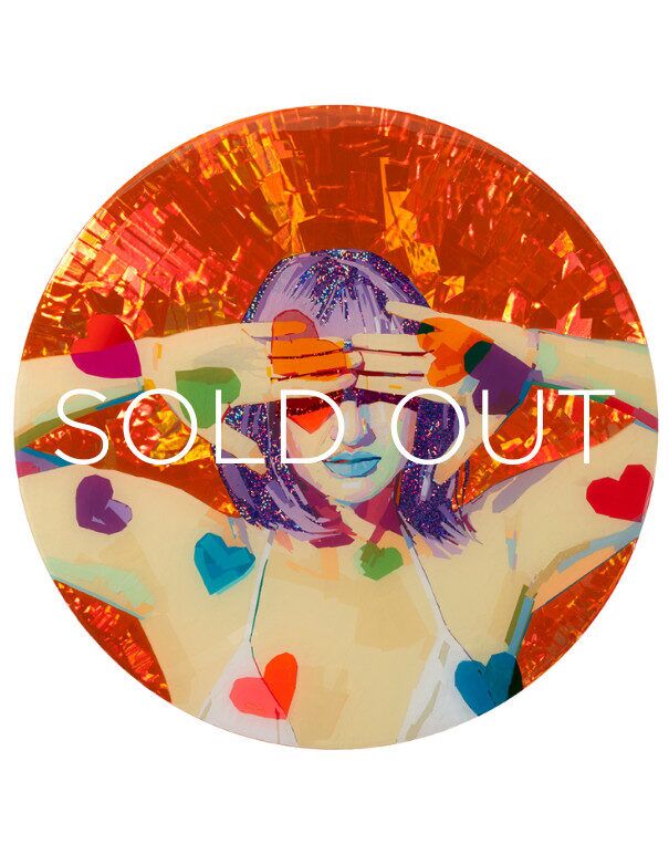 This tape painting is made out of cut and pasted tape and encased in a protective resin. Sarah Stieber’s innovative technique of layering shiny, sparkly, and holographic strips of vinyl, let’s the artwork shimmer and change color depending on the light. With the resin finish it looks as though it is encased in glass.