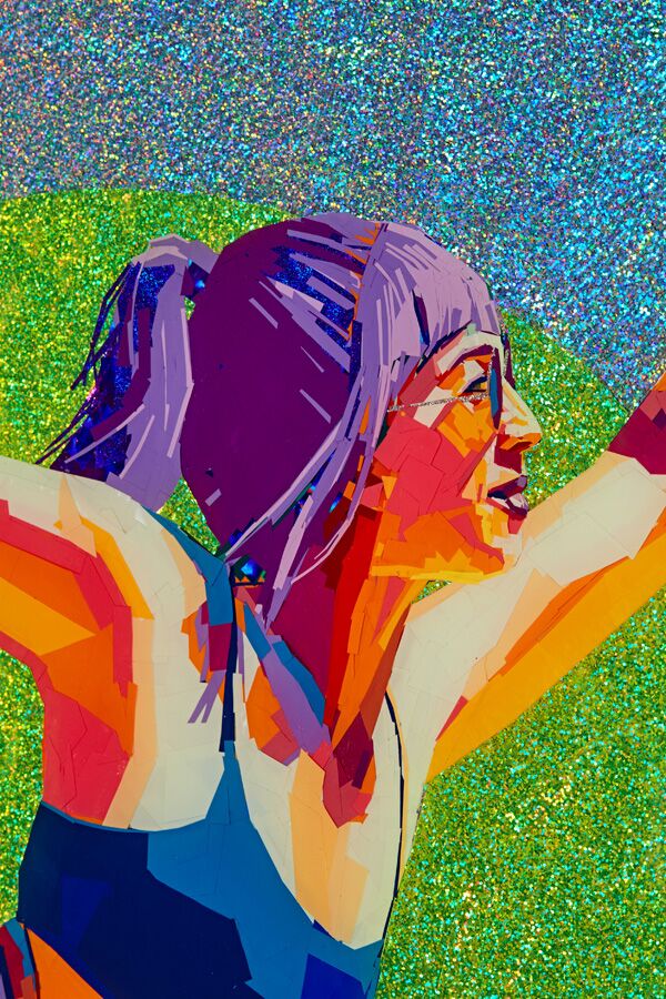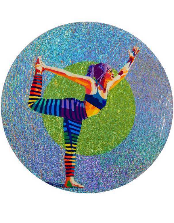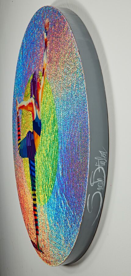 This tape painting uses Sarah Stieber’s innovative technique of layering shiny, sparkly, and holographic strips of vinyl. The artwork shimmers and changes color depending on the light. With the resin finish it looks as though it is encased in glass.