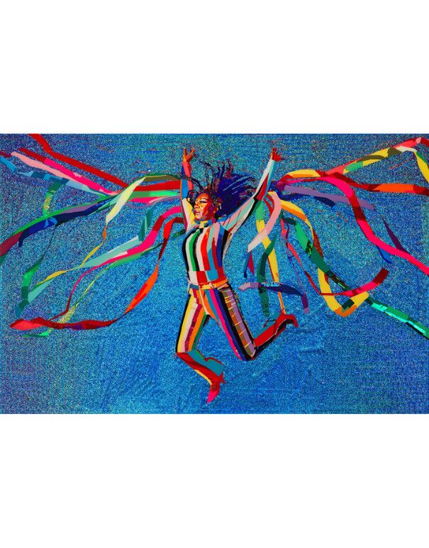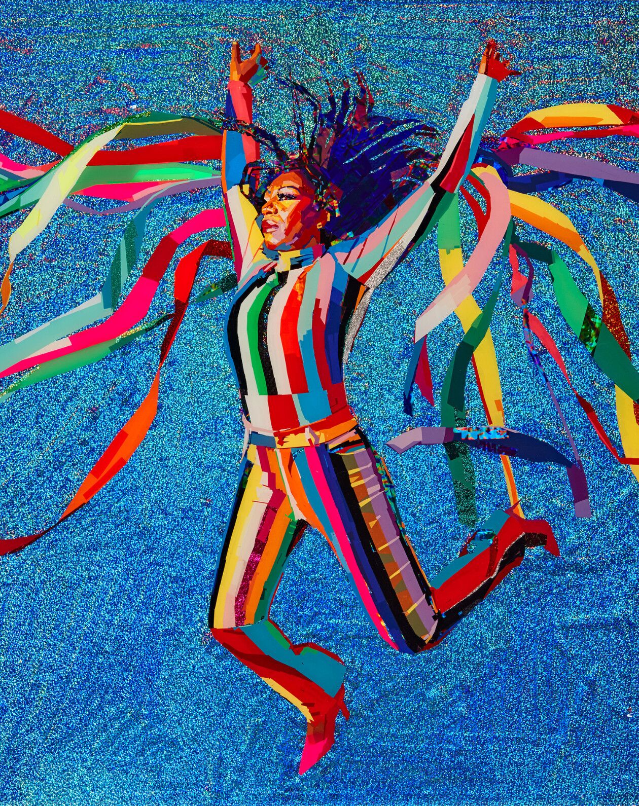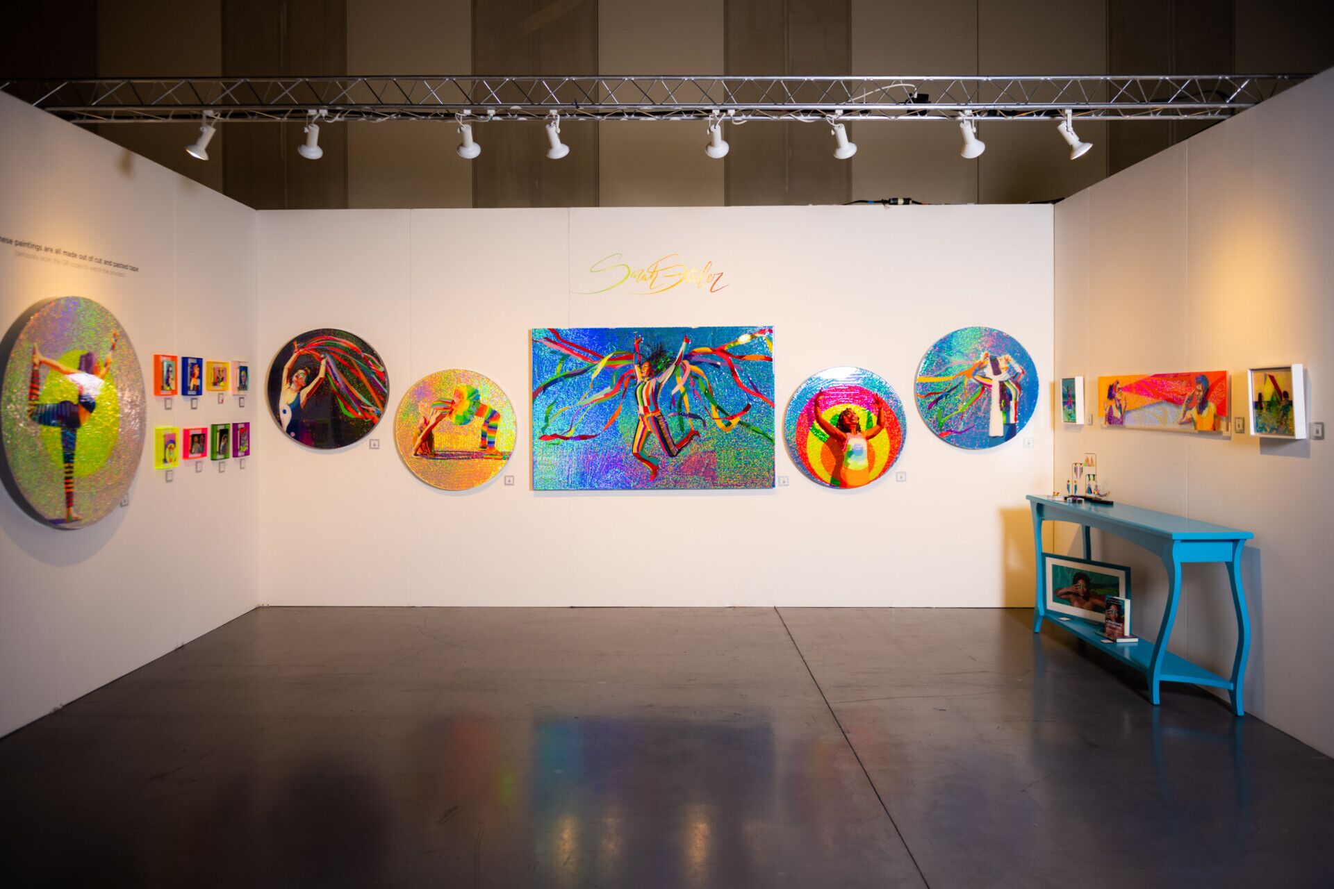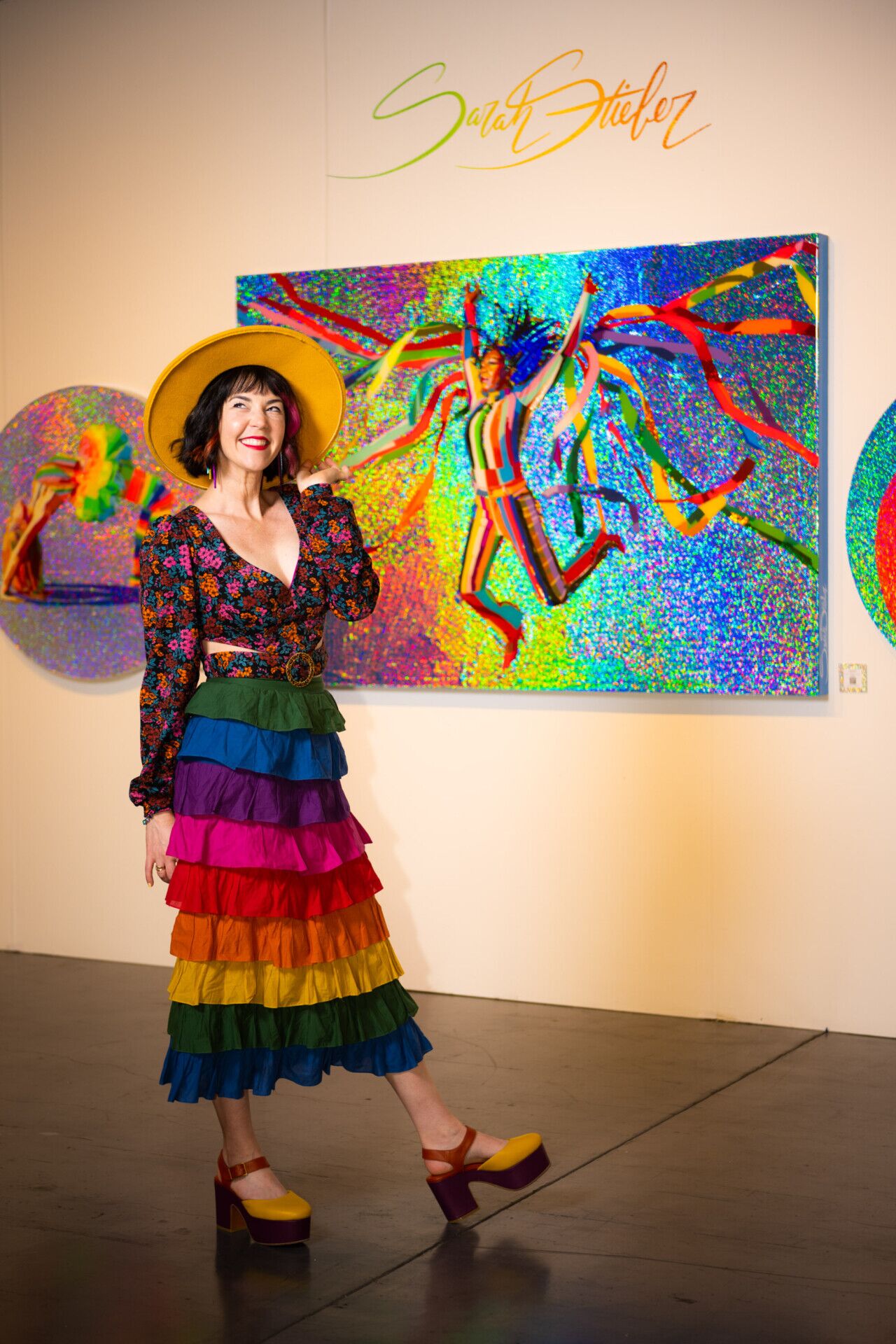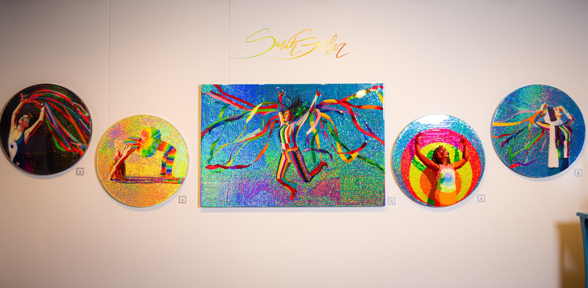 This tape painting uses Sarah Stieber’s innovative technique of layering shiny, sparkly, and holographic strips of vinyl. The artwork shimmers and changes color depending on the light. With the resin finish it looks as though it is encased in glass.