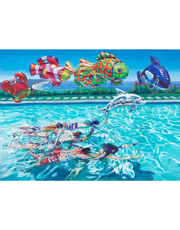 Endless Summer was created in collaboration with John Wayne Airport. Sarah Stieber brings back a limited collection of giclée canvas prints from her sold out water series with characters bedecked in sparkling attire, immersed in reflective waters, and radiating self-expression.