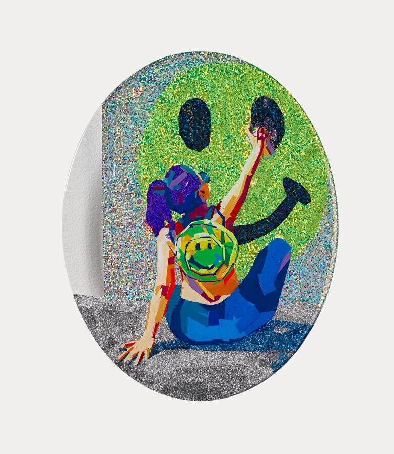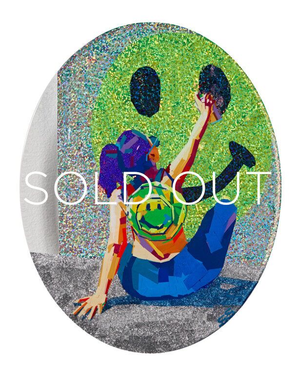 This tape painting uses Sarah Stieber’s innovative technique of layering shiny, sparkly, and holographic strips of vinyl. The artwork shimmers and changes color depending on the light. With the resin finish it looks as though it is encased in glass.