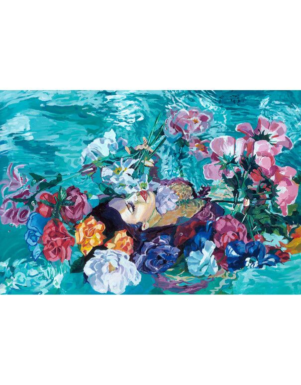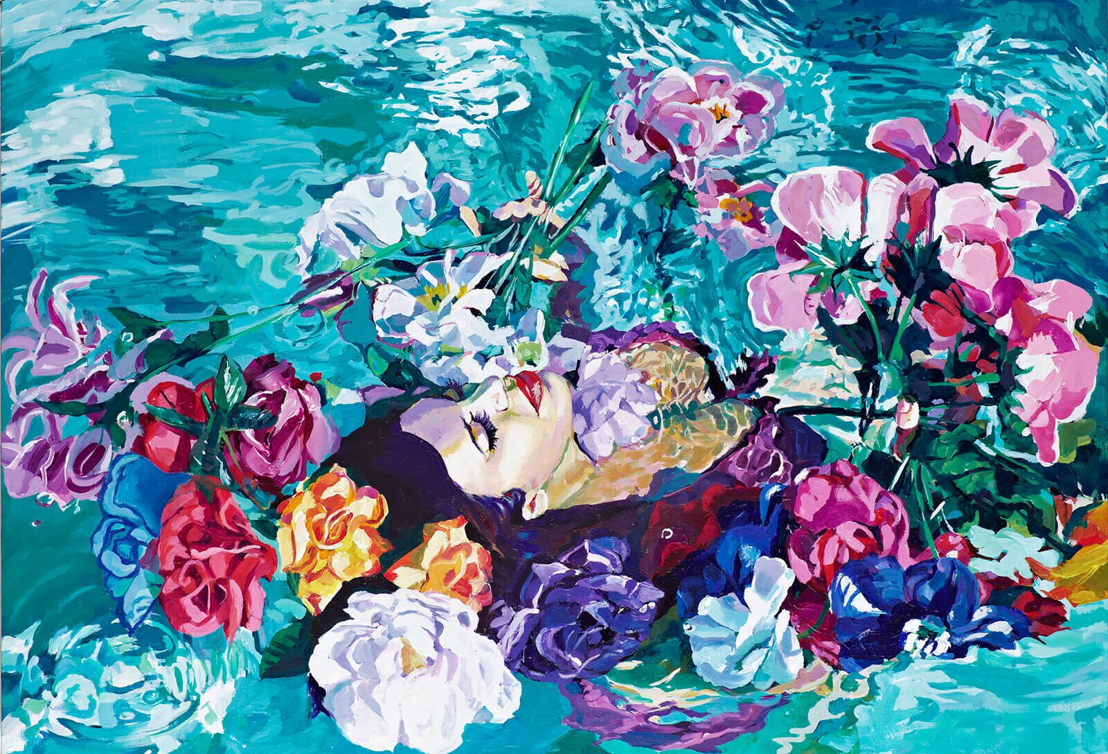 Endless Summer was created in collaboration with John Wayne Airport. Sarah Stieber brings back a limited collection of giclée canvas prints from her sold out water series with characters bedecked in sparkling attire, immersed in reflective waters, and radiating self-expression.