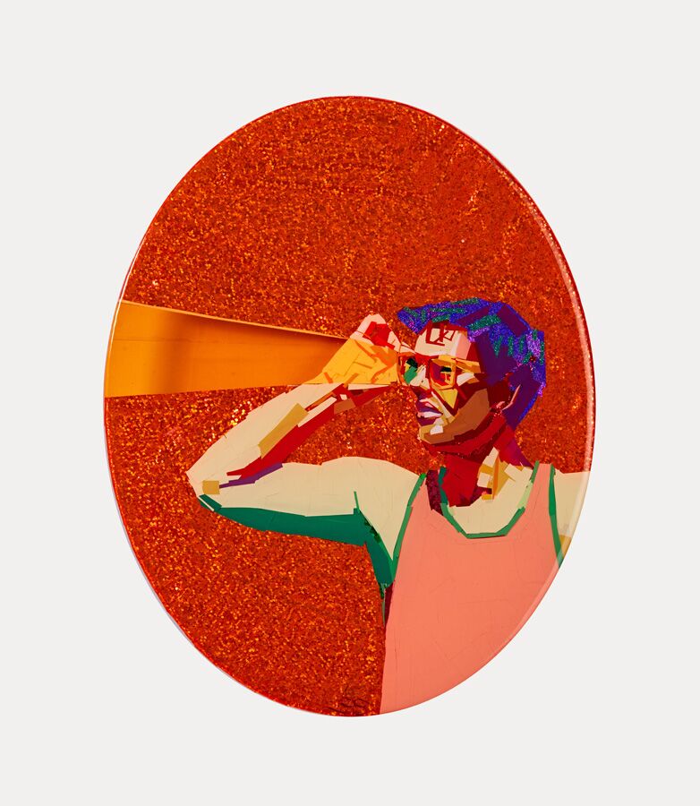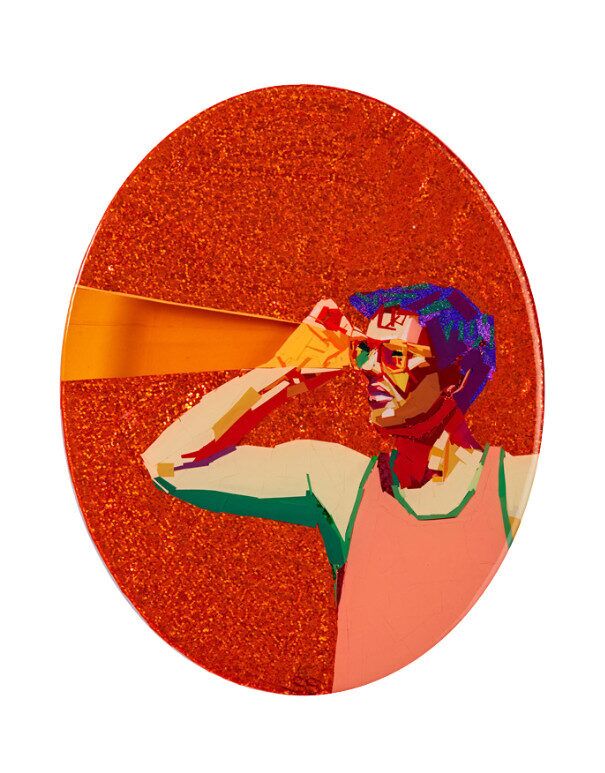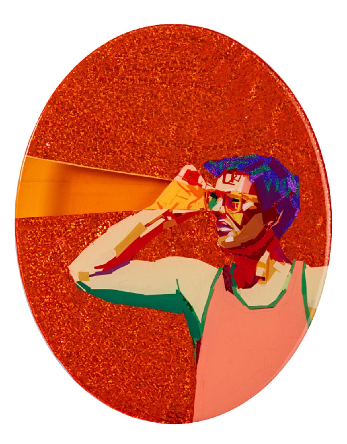 This tape painting uses Sarah Stieber’s innovative technique of layering shiny, sparkly, and holographic strips of vinyl. The artwork shimmers and changes color depending on the light. With the resin finish it looks as though it is encased in glass.