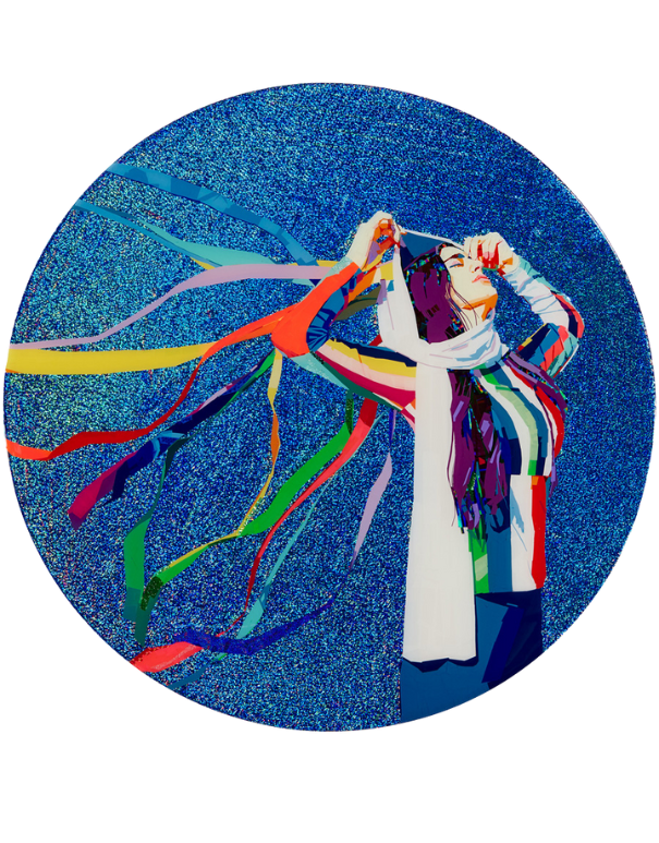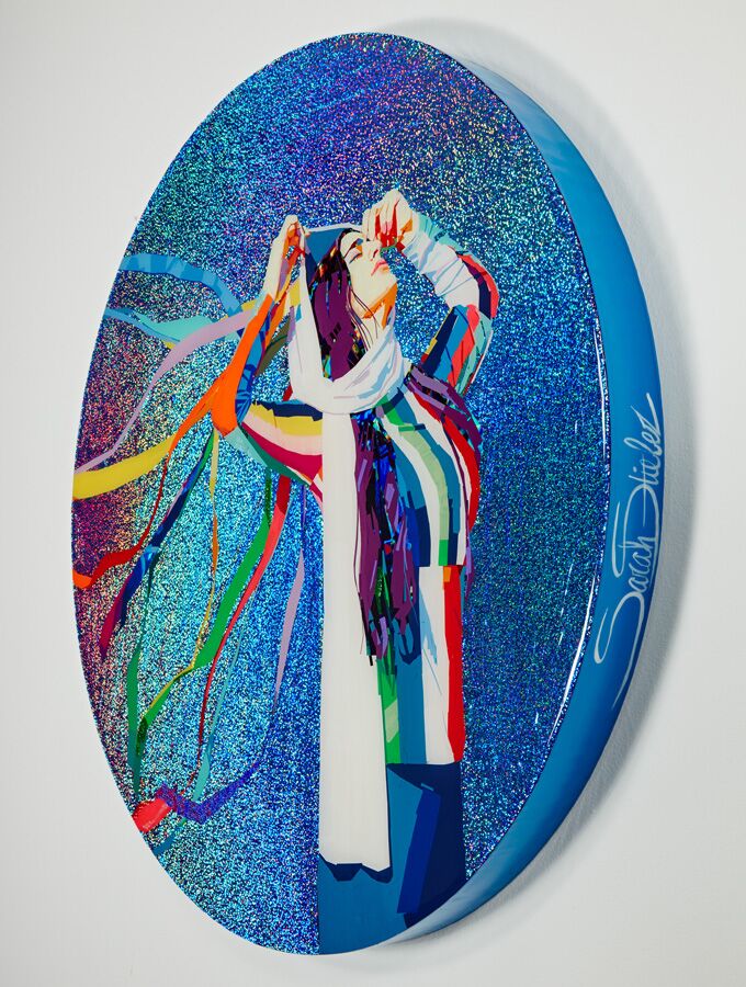 This tape painting uses Sarah Stieber’s innovative technique of layering shiny, sparkly, and holographic strips of vinyl. The artwork shimmers and changes color depending on the light. With the resin finish it looks as though it is encased in glass.
